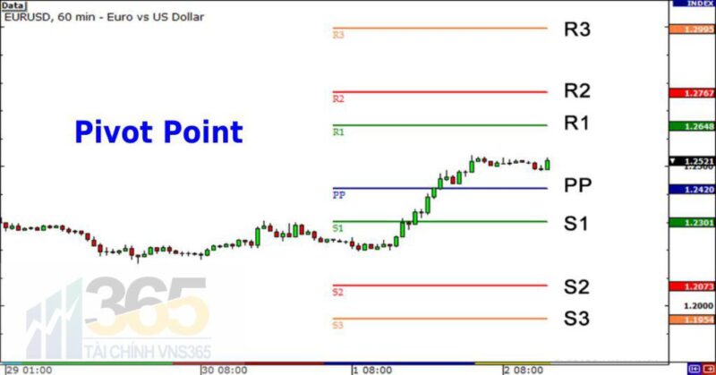 Pivot point có nghĩa là “điểm xoay”, tức tại vùng này giá có thể xảy ra phản ứng đảo chiều. Điểm pivot được xác định dựa trên giá trị trung bình của mức giá cao nhất, thấp nhất và giá đóng cửa của phiên giao dịch trước đó. Nhờ xác định được pivot point, trader có thể nắm được vùng kháng cự và hỗ trợ, hai yếu tố quan trọng khi giao dịch trên sàn.